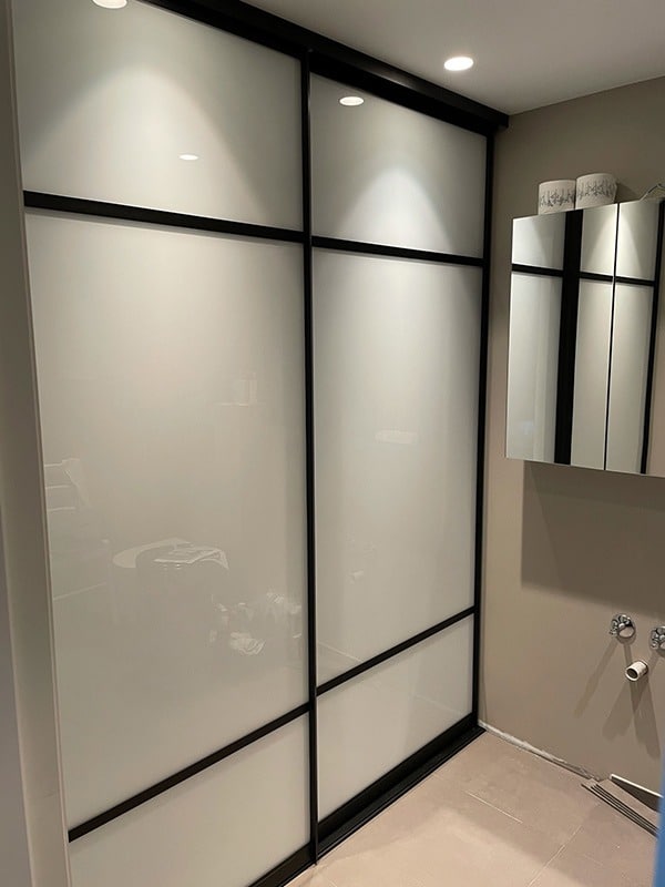 94: skyvedørsgarderobe til vaskerom med hvitt glass og svarte profiler og sprosser i new york loft stil