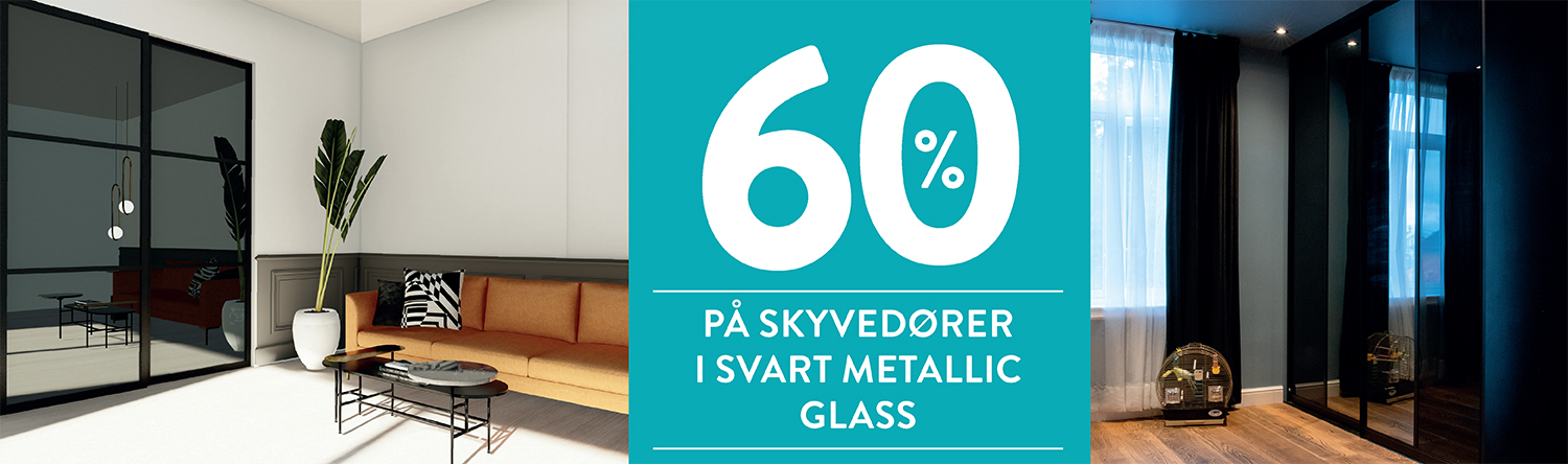 *Get a 60% discount on sliding doors in black metallic glass tailored to you and your home. The offer applies to all our stores: Trondheim, Oslo, Bærum & Asker, Lørenskog, Fredrikstad and Forus. Limited stock – the offer is valid while stocks last. First come, first served!